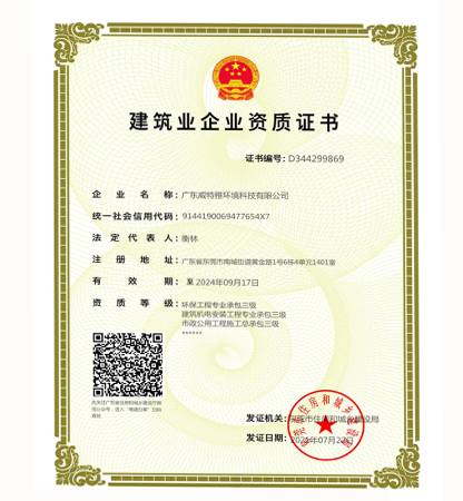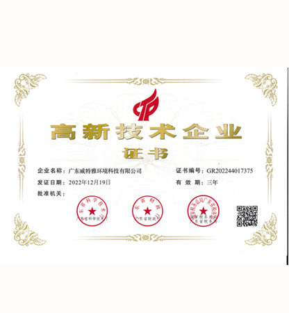 廣東威特雅環(huán)境科技有限公司是國家認(rèn)定的高新技術(shù)企業(yè)和專精特新企業(yè),擁有齊全的項(xiàng)目資質(zhì)證書,通過并嚴(yán)格推行ISO9001、ISO14001、ISO45001等多項(xiàng)體系認(rèn)證標(biāo)準(zhǔn)。