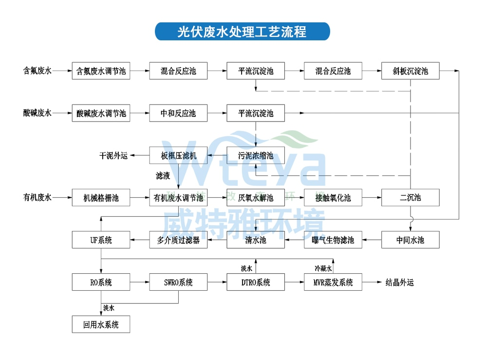 整個(gè)光伏產(chǎn)業(yè)產(chǎn)生的廢水前端處理都集中在硅粉、氫氟酸、COD、高鹽上,廢水處理過(guò)程應(yīng)當(dāng)針對(duì)不同水質(zhì)情況進(jìn)行調(diào)節(jié),然后再深度回收處理,該套系統(tǒng)由前端處理+膜處理+蒸發(fā)結(jié)晶系統(tǒng)組成。