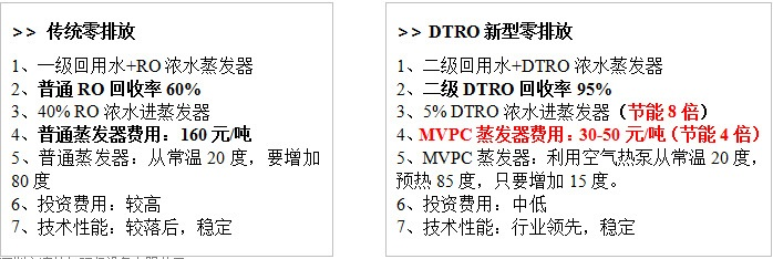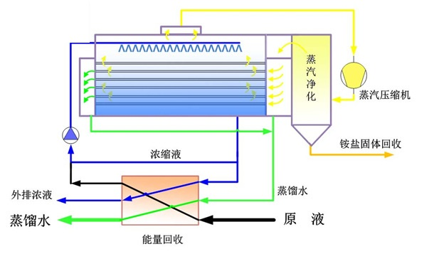 經(jīng)DTRO回用水系統(tǒng)后的廢水進入高效低能耗潔凈蒸發(fā)MVPC裝置, 在蒸發(fā)裝置內(nèi)利用熱泵原理,把原液的水蒸發(fā),蒸汽經(jīng)冷凝后變成蒸餾水排出。