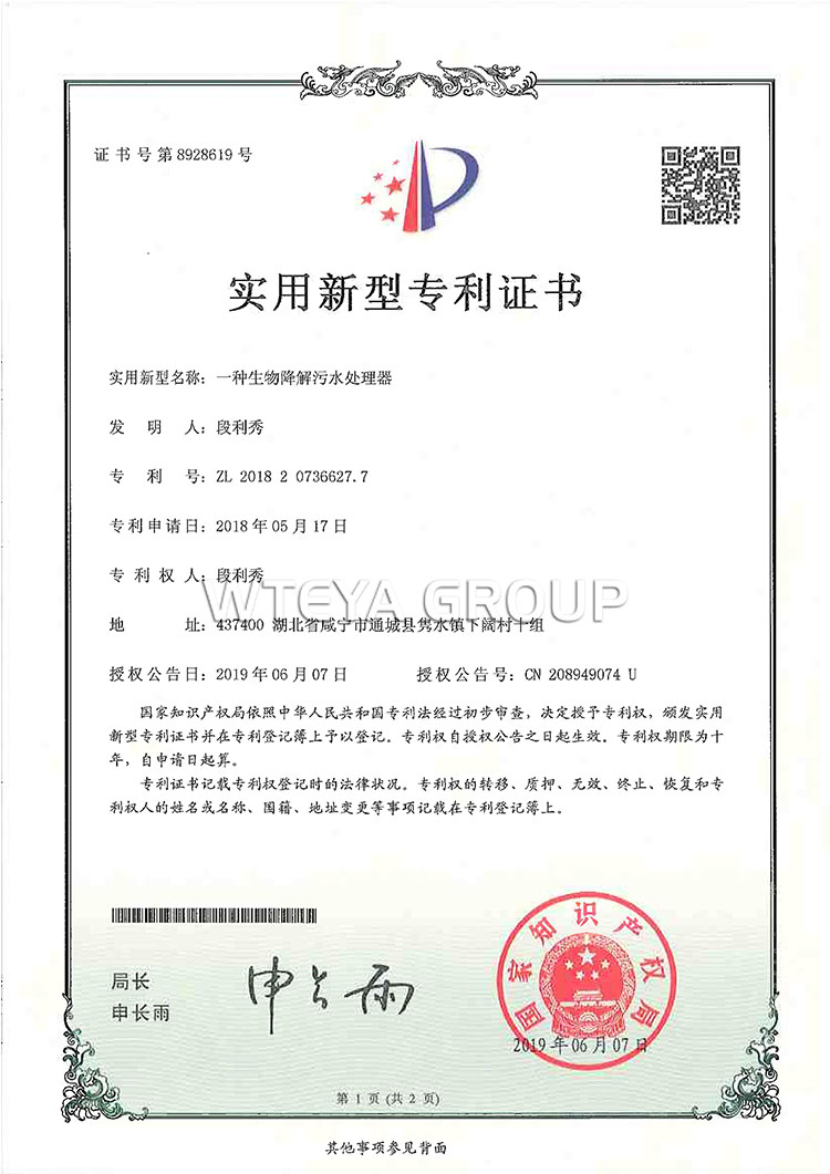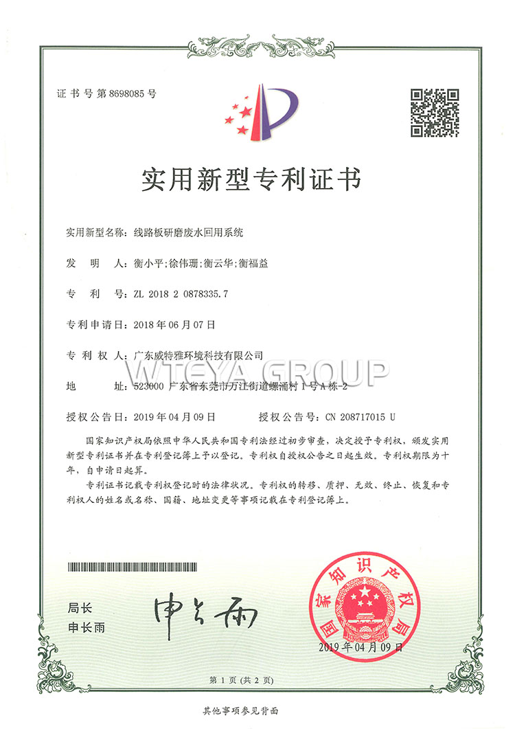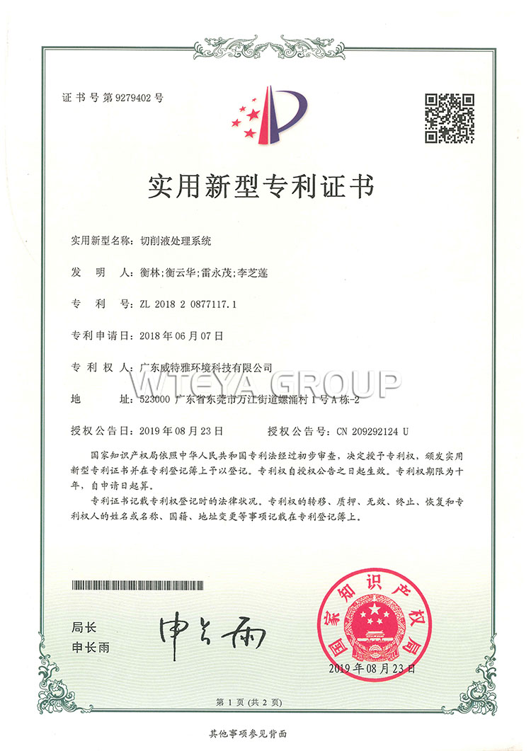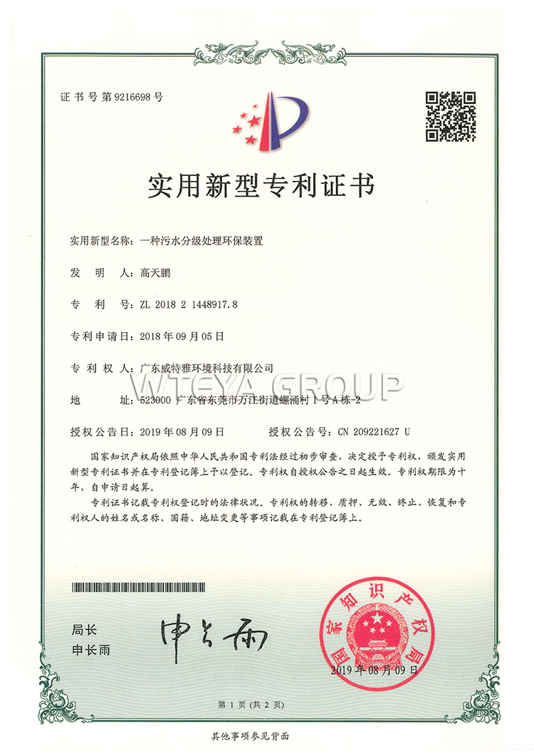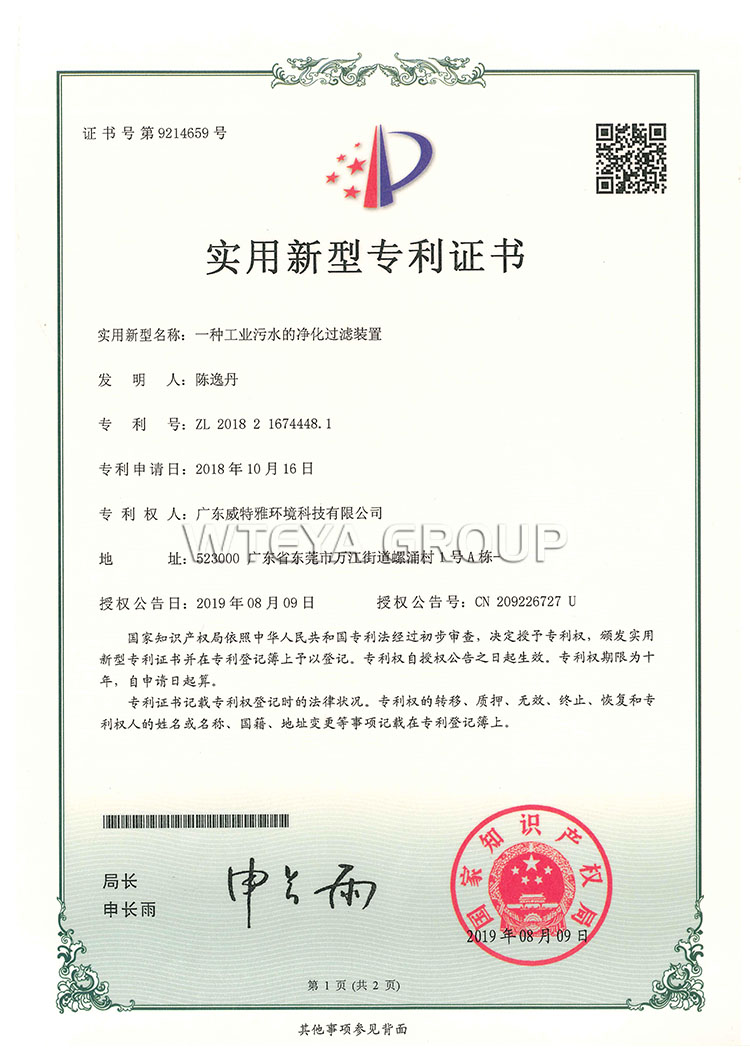 一種垃圾滲濾液處理用壓濾裝置實(shí)用新型專(zhuān)利證書(shū)