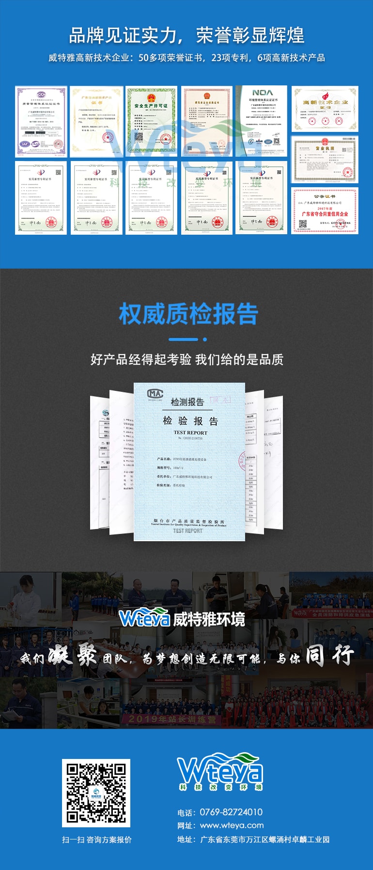 廣東威特雅環(huán)境科技有限公司是一家專業(yè)致力于污水廢水處理的研究、開發(fā)、制造及銷售于一體的高科技企業(yè),有12年的工程經(jīng)驗(yàn),全國建有多家現(xiàn)代化設(shè)備工廠,擁有強(qiáng)大的科研技術(shù)團(tuán)隊(duì)和龐大的運(yùn)營售后團(tuán)隊(duì)200多人。專注于工業(yè)廢水處理、廢水零排放、中水回用、高濃度廢水處理、重金屬廢水處理;提供廢水處理設(shè)備、廢水零排放設(shè)備、中水回用設(shè)備、超純水設(shè)備、軟化水設(shè)備、純化水設(shè)備、反滲透設(shè)備等的生產(chǎn)安裝;專業(yè)承接化工、電子、電鍍、制藥、食品、飲料、化妝品、醫(yī)療衛(wèi)生、汽車、冶金、電力等行業(yè)廢水處理服務(wù),為客戶提供有針對性的一站式廢水處理解決方案,技改方案24小時(shí)響應(yīng)。威特雅資質(zhì)齊全:獲得50多項(xiàng)榮譽(yù)證書,具備建筑機(jī)電安裝工程專業(yè)承包三級(jí)施工資質(zhì),項(xiàng)目覆蓋全國,一對一合作服務(wù),零排放處理技術(shù)成熟可靠,終身售后無憂!