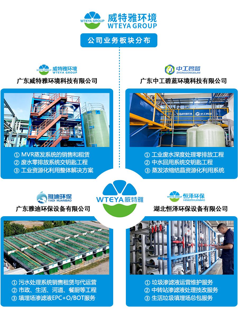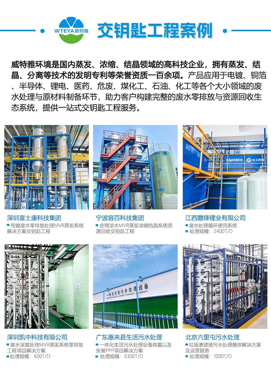 廣東威特雅環(huán)境科技有限公司是一家專業(yè)致力于污水廢水處理的研究、開發(fā)、制造及銷售于一體的科技型企業(yè),十多年經驗,30000㎡生產基地,擁有強大的科研技術團隊和龐大的運營售后團隊500多人。專業(yè)承接鋰電新能源、半導體新材料、工業(yè)、電子、電鍍、制藥、食品、飲料、化妝品、醫(yī)療衛(wèi)生、汽車、冶金、電力等行業(yè)廢水處理服務,為客戶提供有針對性的一站式廢水處理解決方案!研發(fā)生產銷售各種水處理設備,包括MVR蒸發(fā)設備、廢水零排放設備、中水回用設備、膜處理設備、純水設備、超純水設備、軟化水設備、反滲透設備等,資質齊全,擁有100多項榮譽證書,具備建筑機電安裝工程專業(yè)承包貳級施工資質,項目覆蓋全國,一對一合作服務,技術成熟可靠,售后無憂!