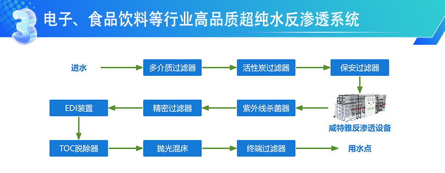 威特雅為滿足不同客戶的需求,推出了以RO反滲透水處理系統(tǒng)為核心的整體解決方案。為電子電路板的制造,酒類飲料行業(yè)的生產用純水等,提供高品質的潔凈水。