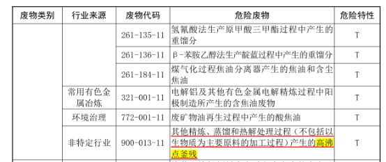2019國家危險廢物名錄(修訂稿)中,將非特定行業(yè)蒸餾產(chǎn)生的所有“釜殘”均歸類為危險廢物,如下圖所示: