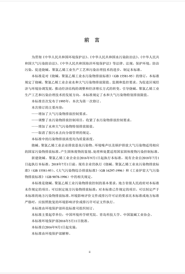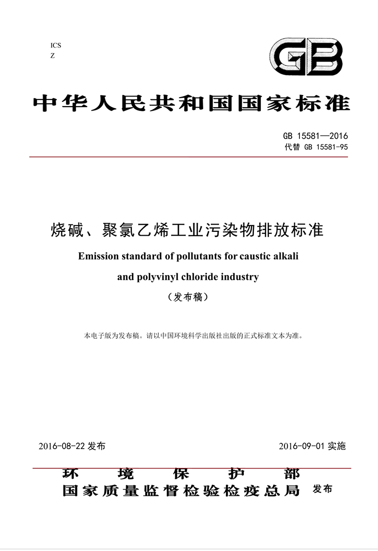 為貫徹《中華人民共和國環(huán)境保護法》、《中華人民共和國水污染防治法》、《中華人民共和國大氣污染防治法》、《中華人民共和國海洋環(huán)境保護法》等法律、法規(guī),保護環(huán)境,防治污染,促進燒堿、聚氯乙烯工業(yè)生產(chǎn)工藝和污染治理技術的進步,制定本標準。本標準是對《燒堿、聚氯乙烯工業(yè)水污染物排放標準》(GB 15581-95)的修訂,本標準規(guī)定了燒堿、聚氯乙烯工業(yè)企業(yè)水和大氣污染物排放限值、監(jiān)測和監(jiān)控要求。為促進區(qū)域經(jīng)濟與環(huán)境協(xié)調發(fā)展,推動經(jīng)濟結構的調整和經(jīng)濟增長方式的轉變,引導燒堿、聚氯乙烯工業(yè)生產(chǎn)工藝和污染治理技術的發(fā)展方向,本標準規(guī)定了水和大氣污染物特別排放限值。