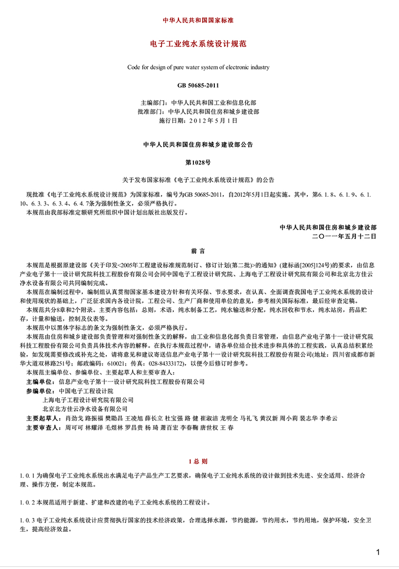 廣東威特雅水處理提供完整版的電子工業(yè)純水系統(tǒng)設計規(guī)范(GB 50685-2011)文檔。