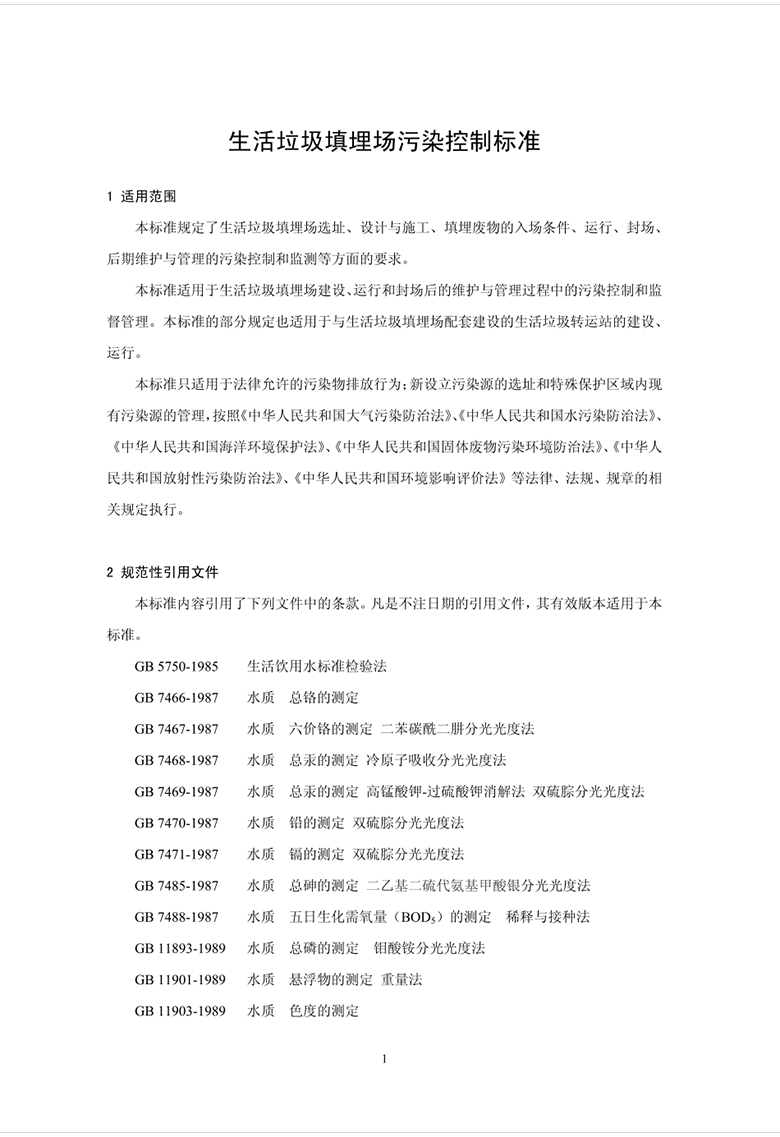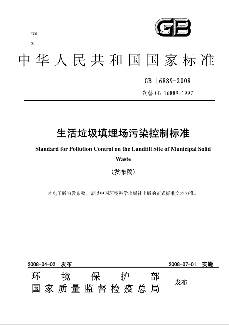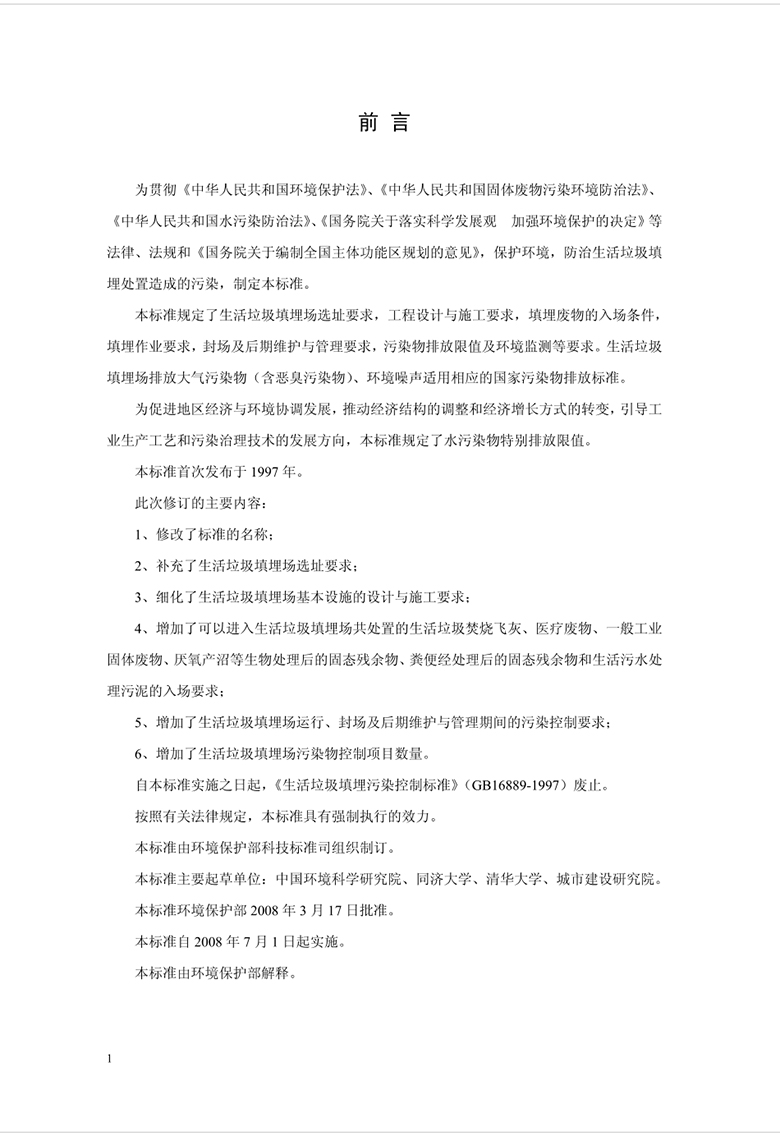 為貫徹《中華人民共和國(guó)環(huán)境保護(hù)法》、《中華人民共和國(guó)固體廢物污染環(huán)境防治法》、《中華人民共和國(guó)水污染防治法》、 《國(guó)務(wù)院關(guān)于落實(shí)科學(xué)發(fā)展觀 加強(qiáng)環(huán)境保護(hù)的決定》等法律、法規(guī)和《國(guó)務(wù)院關(guān)于編制全國(guó)主體功能區(qū)規(guī)劃的意見》,保護(hù)環(huán)境,防治生活垃圾填埋處置造成的污染, 制定本《GB 16889-2008生活垃圾填埋場(chǎng)污染控制標(biāo)準(zhǔn)》。