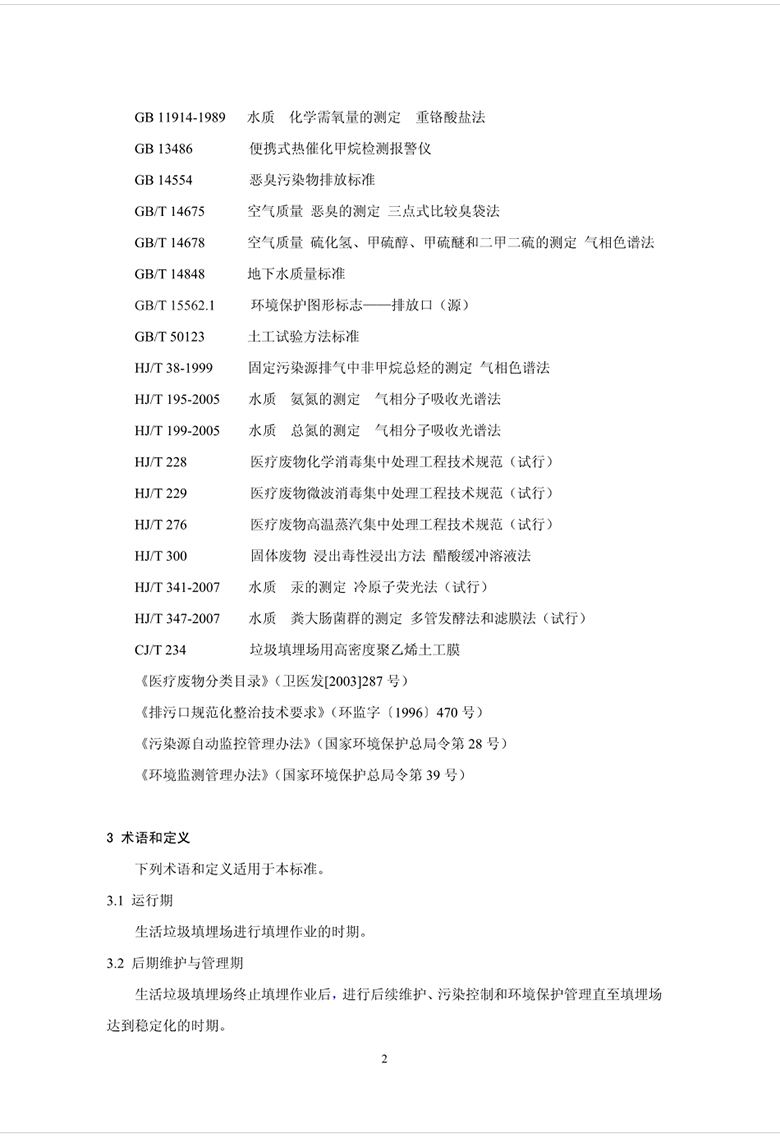 《GB 16889-2008生活垃圾填埋場(chǎng)污染控制標(biāo)準(zhǔn)》規(guī)定了生活垃圾填埋場(chǎng)選址要求,工程設(shè)計(jì)與施工要求,填埋廢物的入場(chǎng)條件,填埋作業(yè)要求,封場(chǎng)及后期維護(hù)與管理要求,污染物排放限值及環(huán)境監(jiān)測(cè)等要求。 生活垃圾填埋場(chǎng)排放大氣污染物(含惡臭污染物)、環(huán)境噪聲適用相應(yīng)的國(guó)家污染物排放標(biāo)準(zhǔn)。