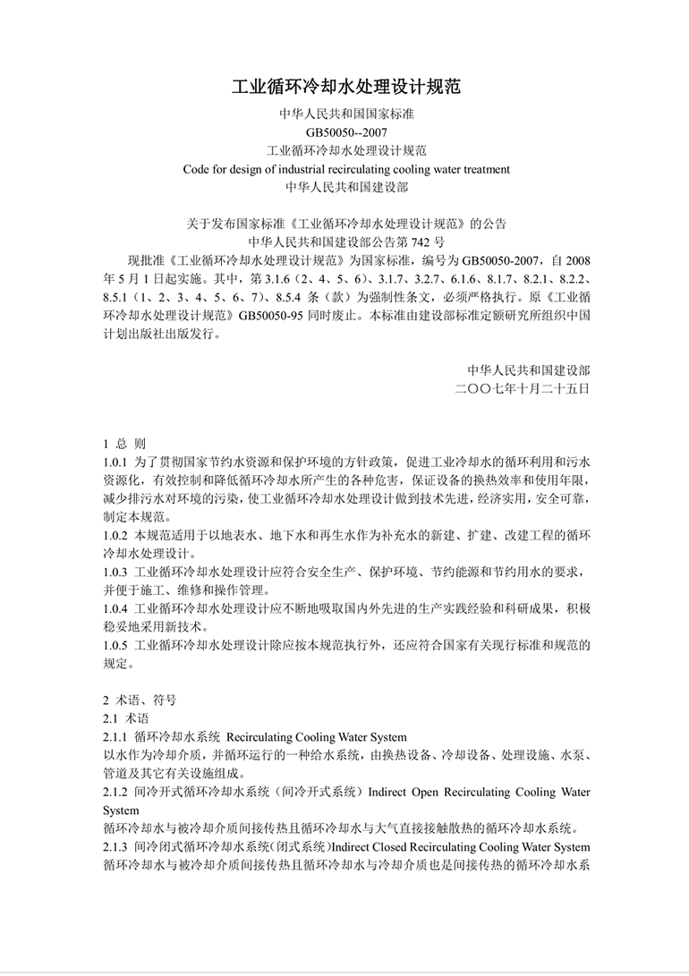 以下是GB 50050-2007工業(yè)循環(huán)冷卻水處理設(shè)計(jì)規(guī)范標(biāo)準(zhǔn)的部分摘要和截圖: