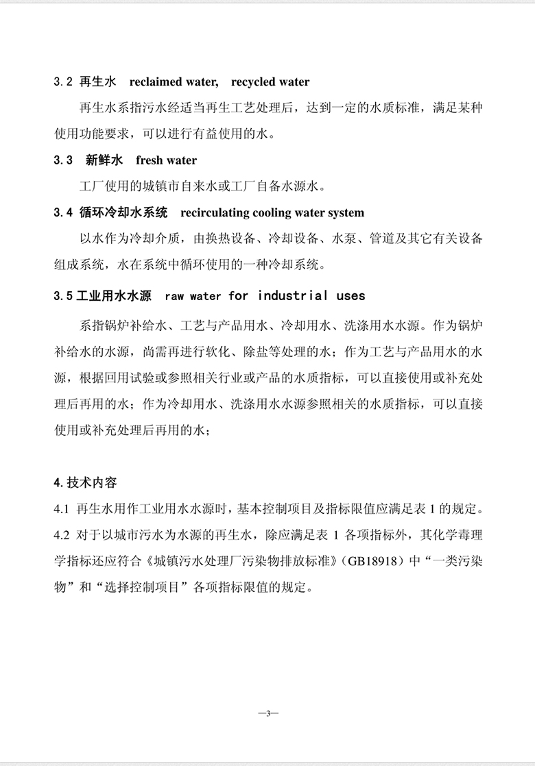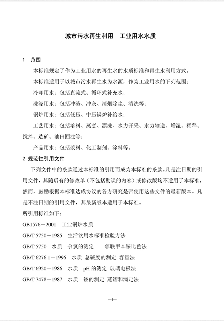 5.3再生水用作工藝與產(chǎn)品用水水源時(shí),達(dá)到表1中所列的控制指標(biāo)后,尚應(yīng)根據(jù)不同生產(chǎn)工藝或不同產(chǎn)品的具體情況,通過(guò)再生利用試驗(yàn)或者相似經(jīng)驗(yàn)證明可行時(shí),工業(yè)用戶可以直接使用;當(dāng)表1中所列水質(zhì)不能滿足供水水質(zhì)指標(biāo)要求,而又無(wú)再生利用經(jīng)驗(yàn)可借鑒時(shí),則需要對(duì)再生水作補(bǔ)充處理試驗(yàn),直至達(dá)到相關(guān)工藝與產(chǎn)品的供水水質(zhì)指標(biāo)要求。