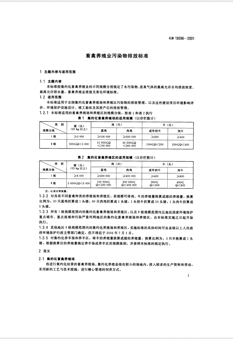 本標(biāo)準(zhǔn)適用于集約化、規(guī)?;男笄蒺B(yǎng)殖場和養(yǎng)殖區(qū),不適用于畜禽散養(yǎng)戶。根據(jù)養(yǎng)殖規(guī)模,分階段逐步控制,鼓勵種養(yǎng)結(jié)合和生態(tài)養(yǎng)殖,逐步實現(xiàn)全國養(yǎng)殖業(yè)的合理布局。