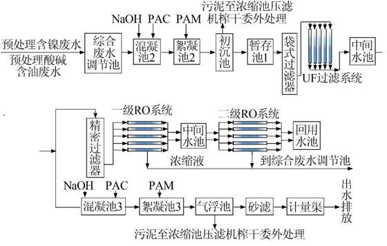 廢水經(jīng)過處理后,要求廢水排放指標(biāo)穩(wěn)定達(dá)到國家《污水綜合排放標(biāo)準(zhǔn)》(GB8978—1996)二級排放標(biāo)準(zhǔn),即pH為6~9,COD≤100mg/L,SS≤70mg/L,石油類≤5mg/L,色度≤50mg/L,總鎳達(dá)到《電鍍污染物排放標(biāo)準(zhǔn)》(GB21900—2008)表2標(biāo)準(zhǔn),即總鎳≤0.5mg/L,實(shí)現(xiàn)約70%的出水回用,余下30%的濃水進(jìn)入深度廢水處理,濃縮液再濃縮,MVR蒸發(fā)處理,力爭零排放無污染。