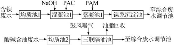 針對含鎳廢水的處理主要是利用混凝化學(xué)法去除廢水中大部分的二價鎳離子,出水進(jìn)入后續(xù)綜合廢水調(diào)節(jié)池。針對酸堿含油廢水,由于該廢水中的油脂多與表面活性劑等混雜在一起,其相對密度小于1,在靜態(tài)下可浮于水面上,因此,先通過隔油池將廢水中大部分的油脂類物質(zhì)除去后,再進(jìn)行后續(xù)的深度處理。
