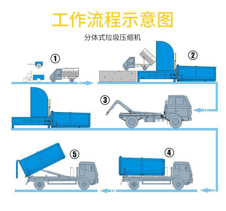 分體式垃圾站壓縮設(shè)備由壓縮裝置(壓縮腔、壓縮推料機(jī)構(gòu)、提升門機(jī)構(gòu)、推拉抱緊機(jī)構(gòu)、